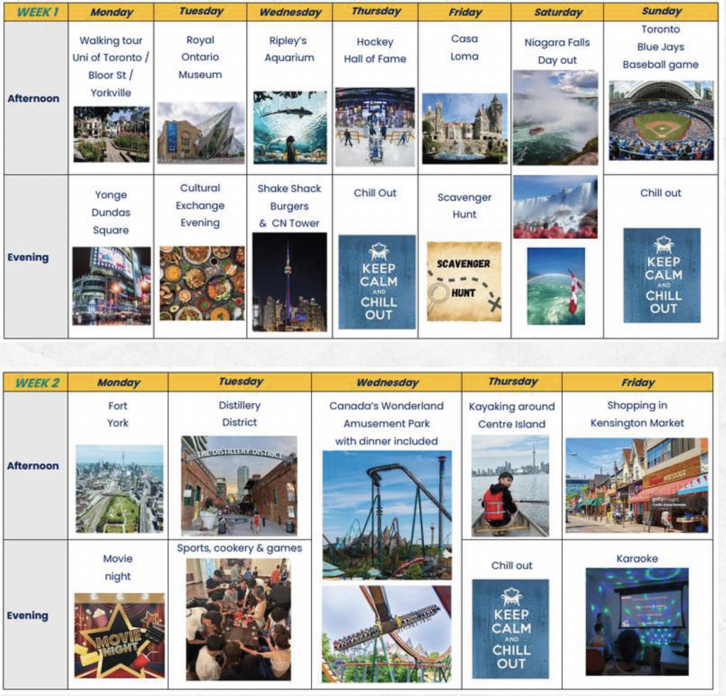 El programa inclou sessions d’anglès orientades a millorar la fluïdesa, un complet programa d’activitats i excursions supervisades, així com allotjament en règim de pensió completa en habitació doble compartida dins d’una residència situada al mateix centre de Toronto.